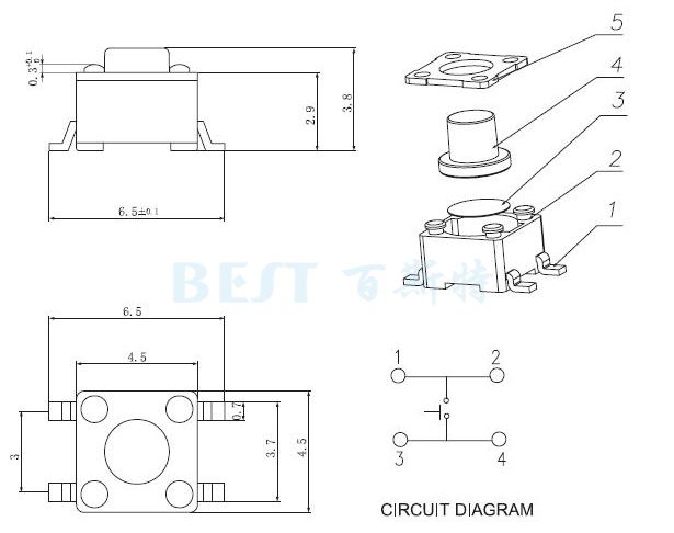 輕觸開關TS-1185E的尺寸3×4,基座高度為1.5,總體高度有1.8/2.0/2.5三種,有帶定位柱和不帶定位柱兩種選擇,一般常用帶定位柱。此款型號可稱為兩腳貼片輕觸開關或3×4貼片小烏龜開關。TS-1185E輕觸開關多適用于醫療,數碼,通訊器材,對講產品等。